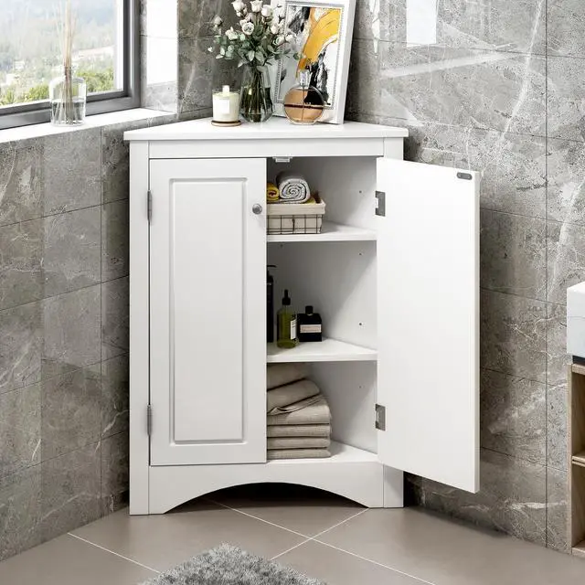 AFFORDABLE CABINET: This corner storage cabinet with doors is designed not only to meet your visual demands, but also to satisfy your functional needs. With inside adjustable shelves, it can meet your various storage needs. Brushed nickle knobs make it convenient for you to open and close.