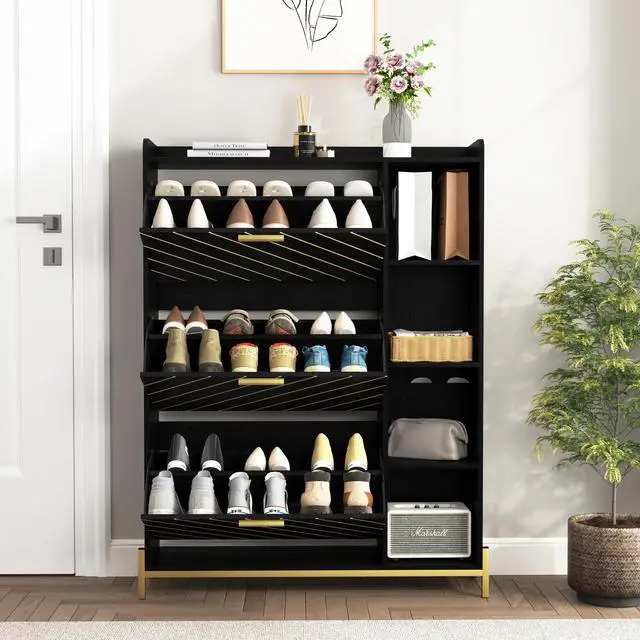 Our freestanding shoe cabinet features space-saving flip drawers that are easy to open and close. Unlike ordinary shoe racks, this narrow cabinet can fit into small spaces, keeping your shoes dust-free and protected from pets and bugs. Enjoy a clutter-free and organized entryway with this modern shoe cabinet.