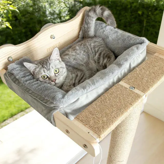 Cat Window Perch with Scratching Post, 46" Adjustable Tall Scratching Posts & Suction Cup Gray Fluffy Cusion, Multi-Level Perch for Climbing, Bird Watching, Play (Drilling-Free)