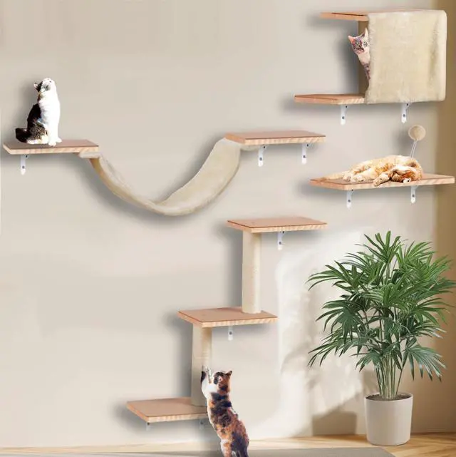 This is a cat wall shelves, featuring cat scratching post, cat jumping platform, Cat Bridge, cat bed, Cat Ladder. Our cat wall furniture is made of natural solid wood, sturdy and odor-free, allowing even larger cats to jump safely. The cat shelves for wall adopts wall-mounted installation, wasting no space. Natural wood and iron brackets allow the wall cat shelves to blend perfectly with your furniture style. Bolts and anchors are suitable for use on brick, thick solid wood, concrete, or similar dense walls. If your wall is made of other materials (e.g., drywall/plasterboard, hollow structures, lightweight cement), you need to prepare suitable fixing bolts by yourself. Please use a 6 mm drill bit to create the hole in the wall. Failure to do so may result in the screw breaking or becoming loose. The longer side of the shelves must be secured to the wooden board; otherwise, it will cause the board to break.