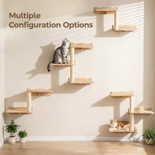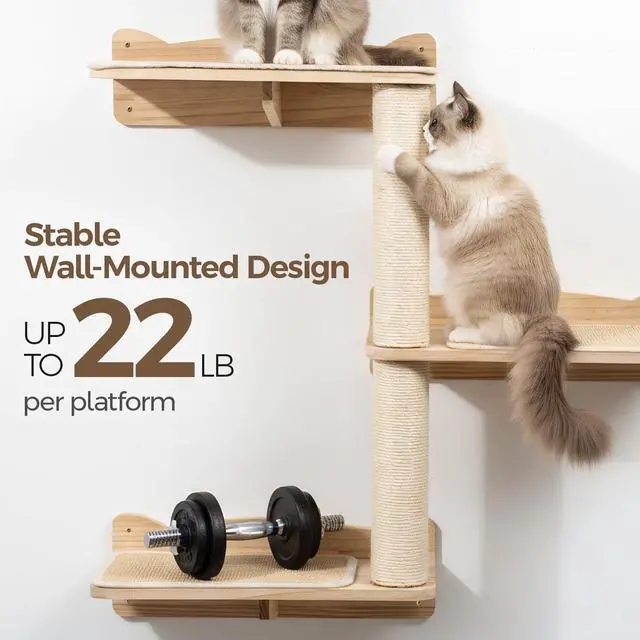 Designed for modern homes and active cats, this 3-tier wall mounted cat shelf system combines climbing, resting, and scratching in one space-saving design. Crafted from one-piece solid pine wood, each platform offers natural strength with a lightweight feel, making it ideal for wall installation. The integrated sisal scratching post provides the textured resistance cats love, helping satisfy natural scratching instincts while protecting your furniture. Removable mats with Velcro fastening allow for easy cleaning and everyday comfort, while rounded corners add a smooth, pet-friendly finish. With a modular layout, the shelves can be arranged to fit different wall spaces and climbing habits, creating a vertical playground that supports daily exploration, exercise, and relaxation.