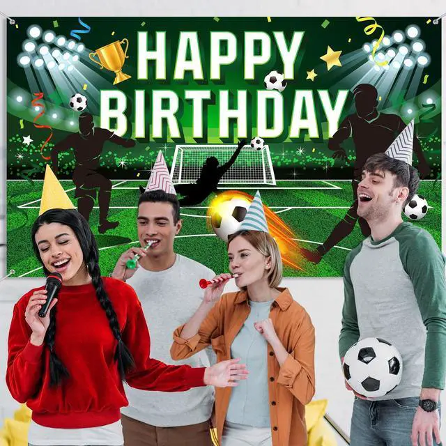 Soccer Party Backdrop: The soccer birthday party backdrop features a vibrant soccer field design with players and "Happy birthday" letters, making it perfect for a themed celebration and serving as a stunning background for your decorations.