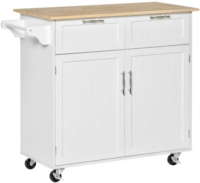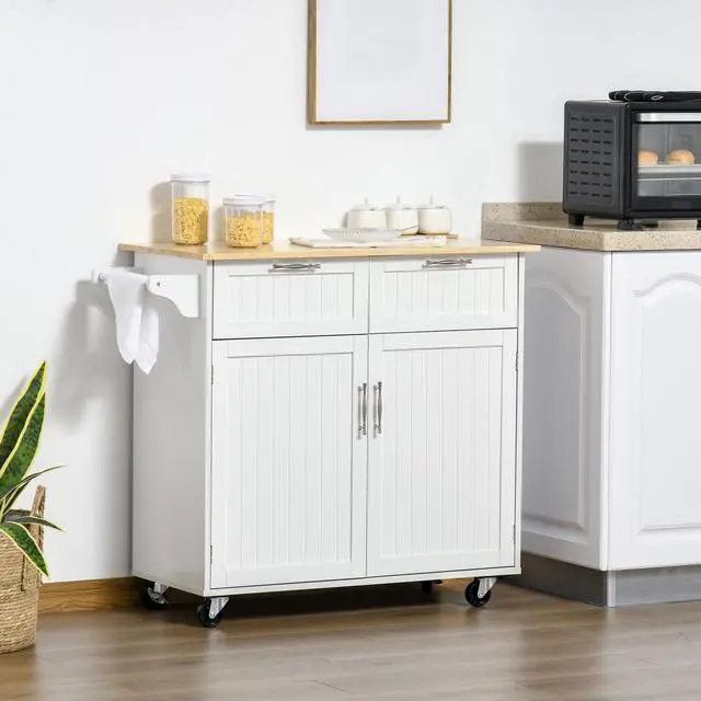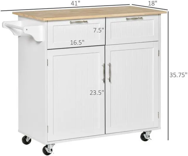 This kitchen serving cart is an excellent option for your home parties. This kitchen trolley offers drawers, an enclosed cabinet, and a towel rack to provide ample space for supplies and accessories. The adjustable shelves let you store different-sized items. Easy-roll wheels allow you to move wherever it is needed most. A two-tone palette naturally is suitable for most home furnishings. Solid rubberwood tabletop and MDF panels ensure durability and easy cleaning.