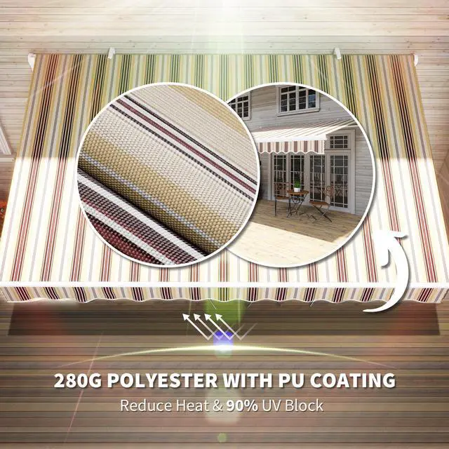 With a tough aluminum and steel frame, Aosom retractable patio awnings offer outdoor shade. Our awnings create a cool, comfy place on your patio and protect you from UV rays. The reinforced frame and water-resistant polyester fabric make our window awnings superior in material and excellent in workmanship. Our door awnings let you enjoy protection and an accent piece at a reasonable cost. They easily mount on the wall with the included accessories. Get out, get comfy, get Aosom.