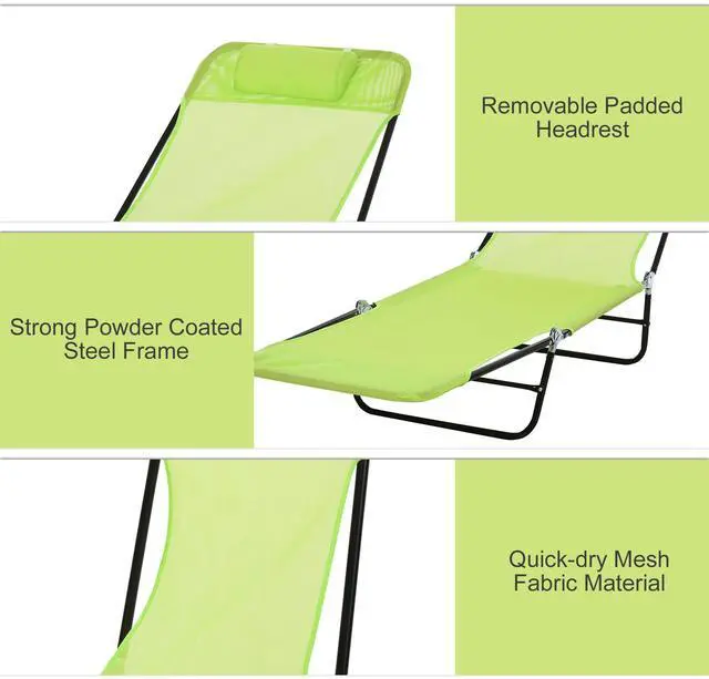 Wish you could pack up the comfort of the resort and bring it with you on the road? You're a step closer. Aosom has a folding lounge chair, so you can lay back in the sun at the beach, while camping, or at the pool. It features a reclining backrest with five positions and a pillow to take it to the next level. Pick your favorite tanning angle and get the most out of your summer snooze. Made with water in mind, the mesh surface dries off fast, even if you just got out of the pool.