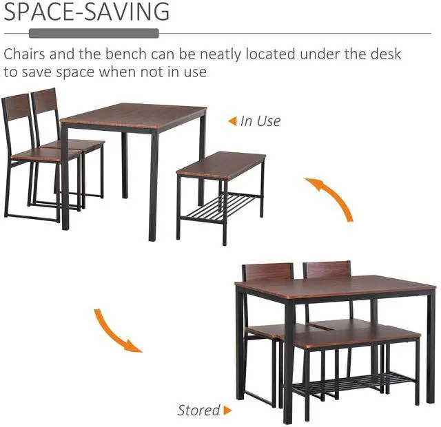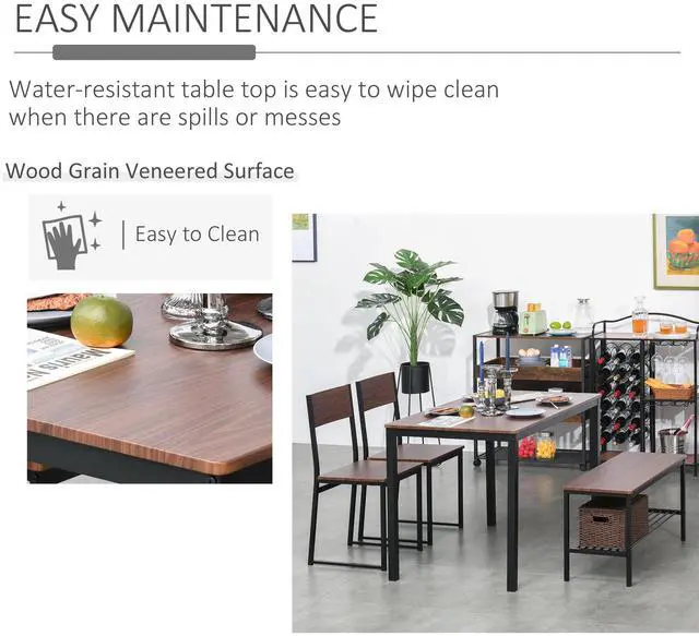Make meal times better and clean-up a breeze with this Aosom kitchen table and chairs for 4. With an industrial design, the dark brown and black color of the dining room table set for 4 is stylish and distinct. Push the kitchen chairs and bench under the table to save space in your dining room. Each frame is made from steel for strength and fitted with thick MDF seats and tabletop. This dining room set features four chairs and a large table - enough room for the whole family. Create a simple home decor space with this dinette set for 4 from Aosom.