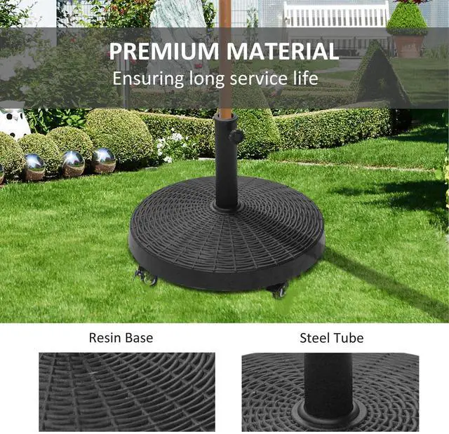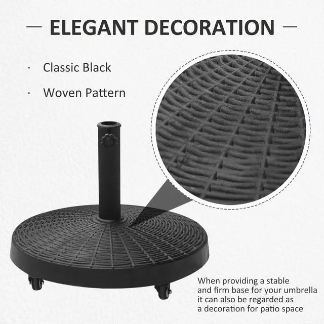 This Aosom rolling umbrella base can make your umbrella mobile. Easily roll your patio umbrella over to a table and chairs and create a relaxing oasis. The umbrella holder features an adjustable knob to keep your source of shade in place, and the top of the base has an appealing woven motif to make it an easy accent piece. Give your garden ease of use and elegance. Get out and get comfy with an Aosom patio umbrella base.