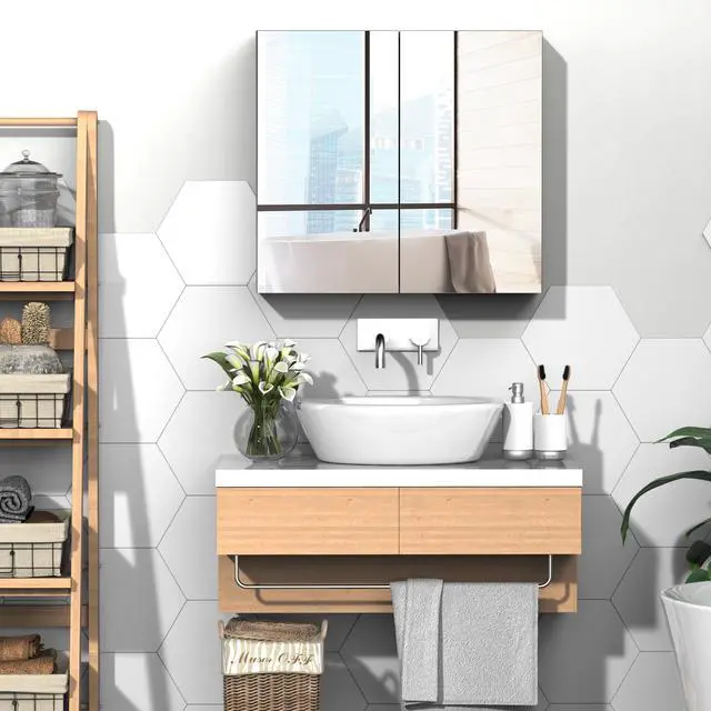 This Aosom bathroom cabinet offers a stylish look and generous storage space. It features a mirrored door design and 3-tier storage space in different height sizes to store all of your essentials, from makeup and toiletries to medicine and first-aid supplies. This bathroom vanity mirror is made from painted steel material, which greatly extends the life of the unit. Itâs an ideal solution for keeping your bathroom space neat, tidy, organized, and stylish.