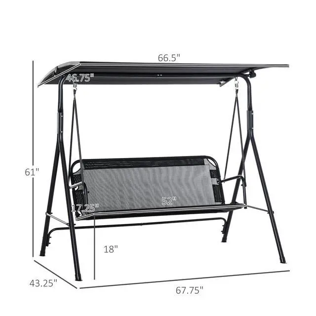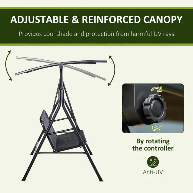 Swing through the summer and soak up the sun on an Aosom outdoor porch swing chair. Made with a heavy-duty steel frame crafted into a stable A-shape, it seats two adults. Place it in outdoor spaces like, the porch, by the poolside, garden, by the backyard, or on the balcony. Featuring quick-drying mesh and an adjustable canopy that lets you swing even if there's been rain. Tilt the top so you can stop sunburns and get rid of glare. Get out, get comfortable, get Aosom.