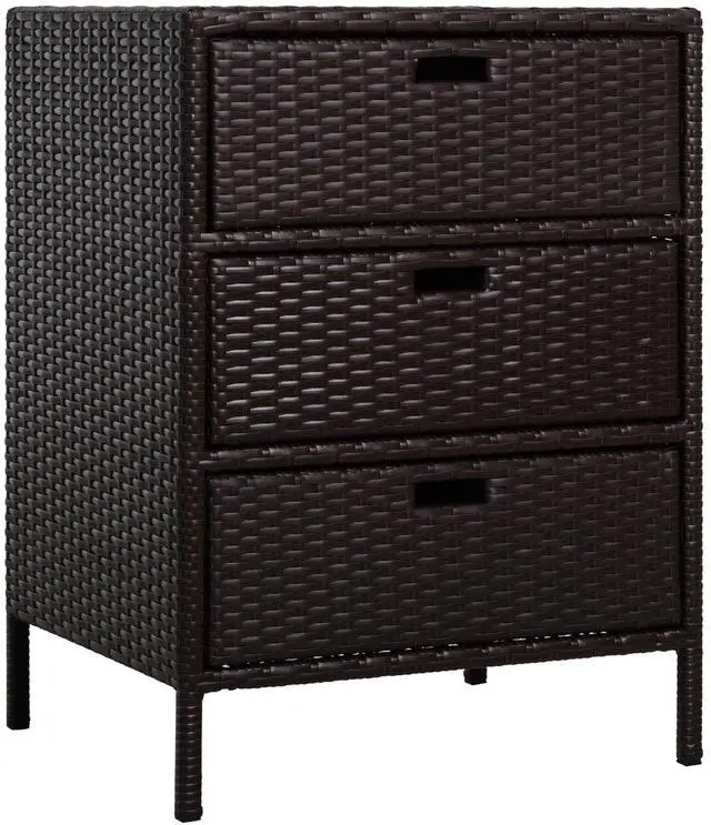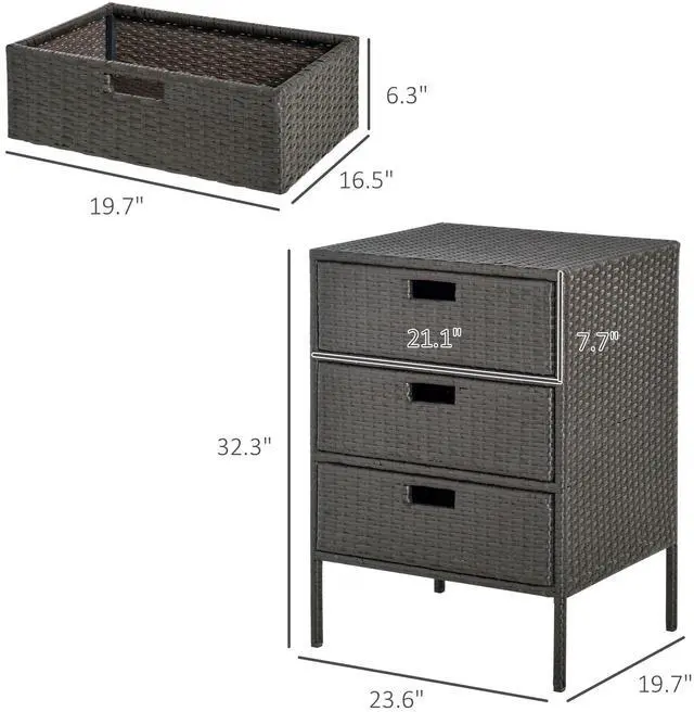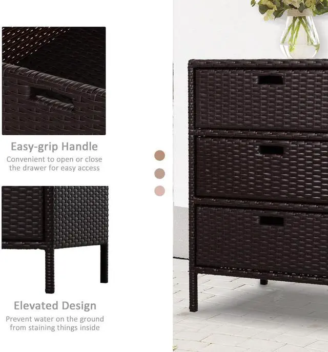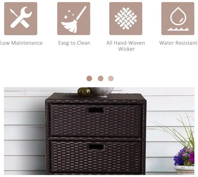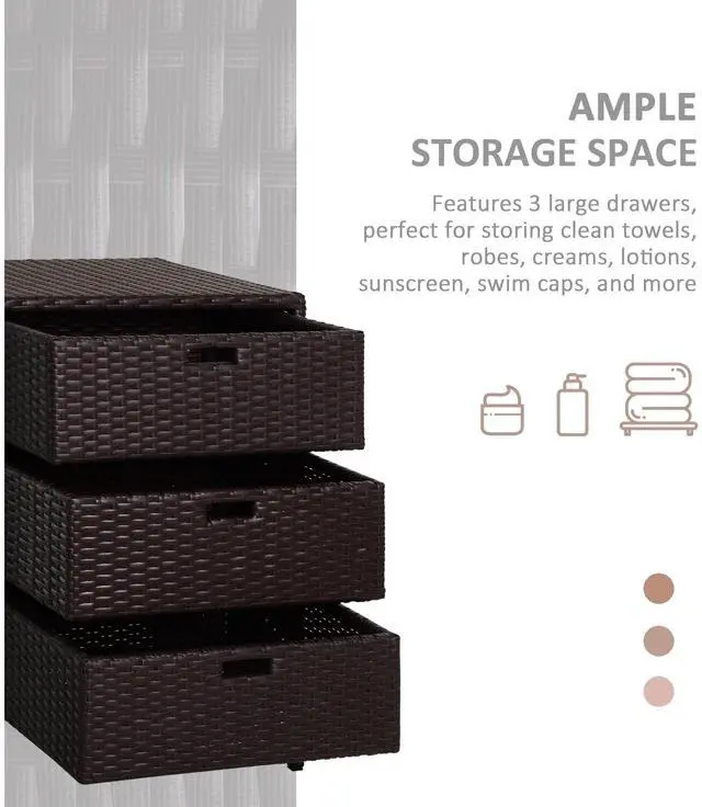 Keep towels and pool supplies close and dry with Aosom's outdoor rattan storage cabinet. Hand woven for a classic wicker feel, our pool storage cabinet is built with PE rattan for better water resistance. Three drawers let you store and organize suntan lotion, towels and other pool supplies. It has a steel frame that holds 110 lbs. and a powder coat to keep water worries away. Get out and get comfy; invite the feel of the spa to your home with Aosom poolside storage today.