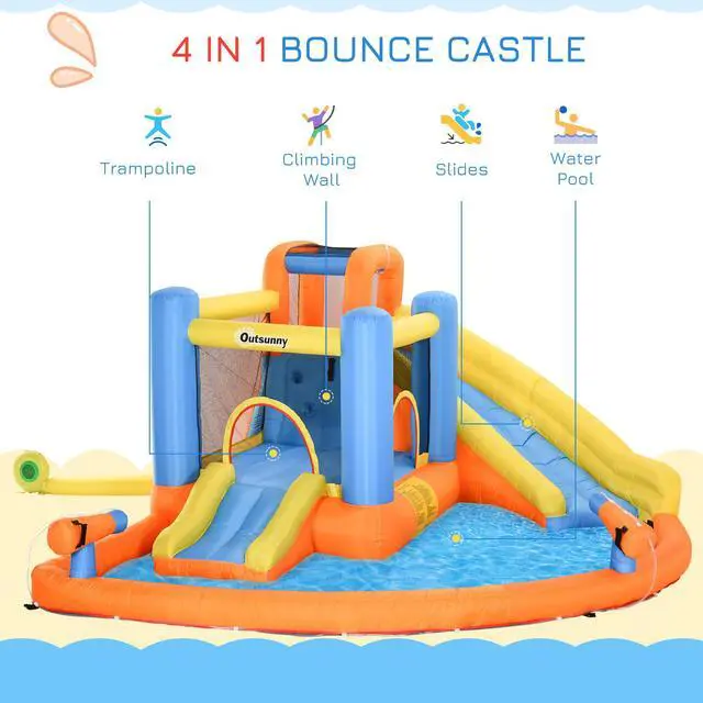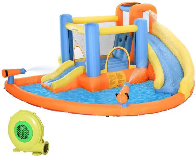 With a great layout and fun design, our Aosom bounce house will be the talk of all the kids in the neighborhood! Bring the fun of the fair home with you. With a high-quality transport and storage bag, you can bring the fun wherever and whenever. We made the layout of the bouncy castle varied for the most fun: a trampoline, big slide, pool area, and climbing wall all allow kids to go wild and burn some energy. Furthermore, the 840D high-density oxford fabric is secure on kids. We made sure to include ground stakes too, so your new bouncy house for kids has no risk in the wind. Check out this inflatable castle and jump into the fun!