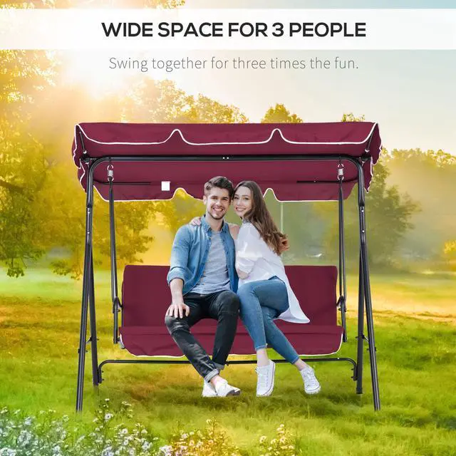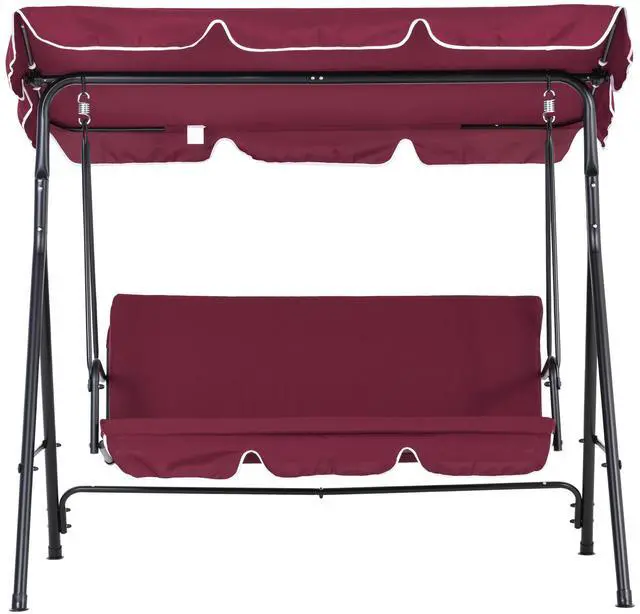 Swing through the summer on an Aosom patio swing. Made with a heavy-duty steel frame crafted into a stable A-shape, and featuring soft, thick cushions, it seats three adults. Place it in outdoor spaces like the porch, by the poolside, garden, backyard, or on the balcony. It features an adjustable canopy that lets you swing even if there's light rain. Tilt the top so you can stop sunburns and get rid of glare. Enjoy gently swaying in the breeze with a friend; summer's going to be great.
