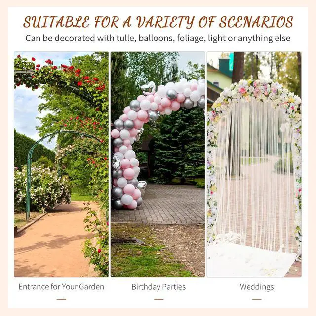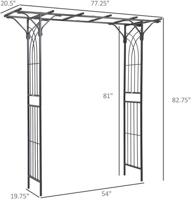 Bring quaint, rustic charm to your backyard with this elegant and delicate scrollwork garden arch from Aosom! Constructed of durable, sturdy square section metal and coated in epoxy for enhanced weather protection, this garden arch compliments any garden decor. The horizontal bars of the garden trellis provide structural support and serve as a convenient place to hang lightweight potted plants. The trellis-style sides are perfect for growing climbing vine plants, or for hanging small accent lights to create a beautiful entryway into your garden. Easy to assemble with complete instructions included, this arbor arch will make a delightful addition to your outdoor garden space.