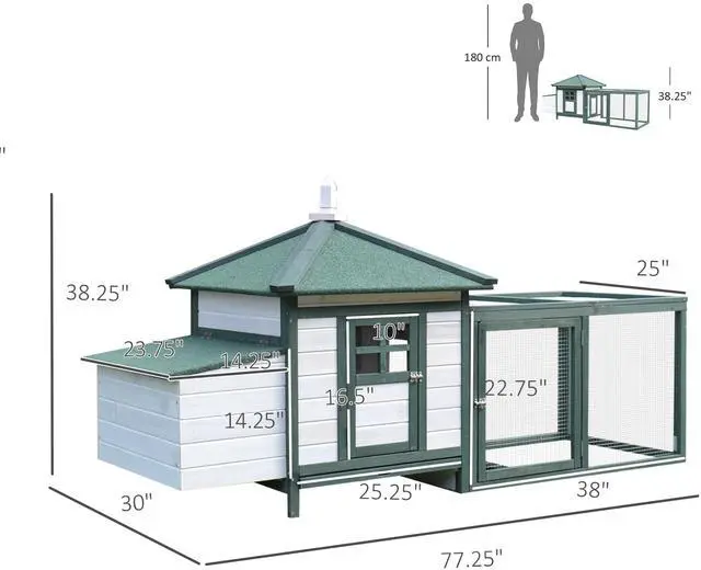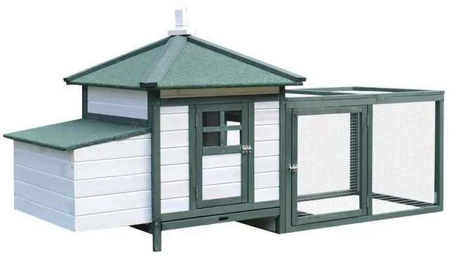 • Aosom 77" Wooden Chicken Coop Hen House Poultry Cage with Weatherproof Roof, Nesting Box, Enclosed Run and Removable Tray for Outdoor Backyard, Green