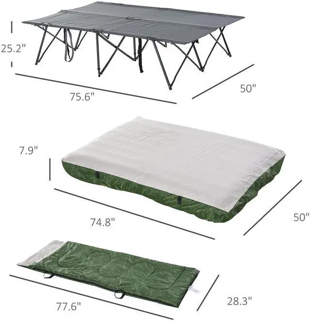 Aosom's tent cots for camping will make your outdoor experience much more enjoyable. We made sure to include everything in this travel cot set: a camping cot, an inflatable sleeping pad with 2 pillows and 2 pillowcases, a foot pump, a textile cover, a sleeping bag, and a carrying bag. This means less time worrying about the cot bedding set and more time enjoying nature. Furthermore, this 2 person cot set is simple, so you spend more time having fun and less time getting ready.