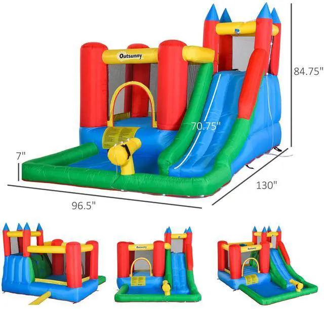 This jumping castle from Aosom provides a thrilling immersion of water play and bouncing. From making a basketball game out of the trampoline zone, and letting kids practice aim, to enjoying a water cannon that enhances the pool excitement, this kids play house lets friends and siblings go wild and burn some energy. The climbing wall up to the slide adds healthy exercise, building not only strength but the confidence of reaching the top and the joy of riding down to a splash.