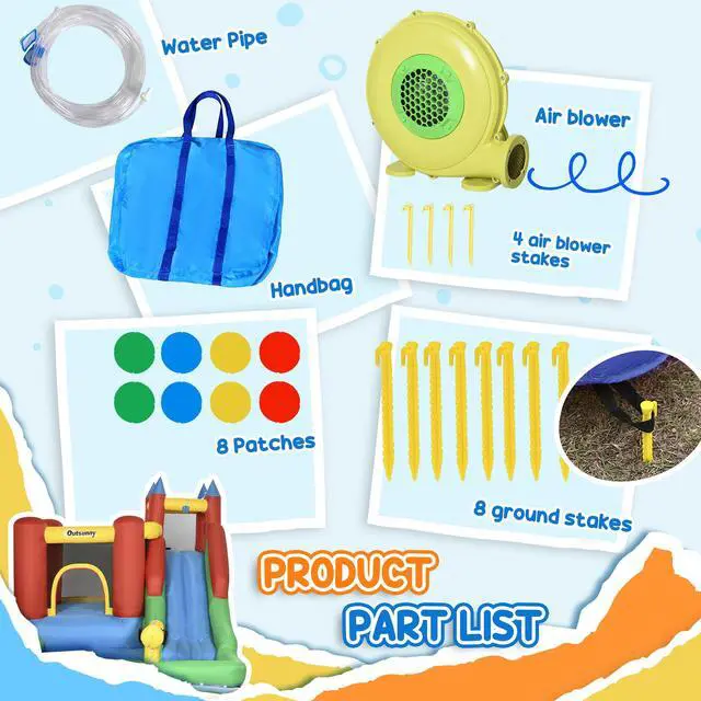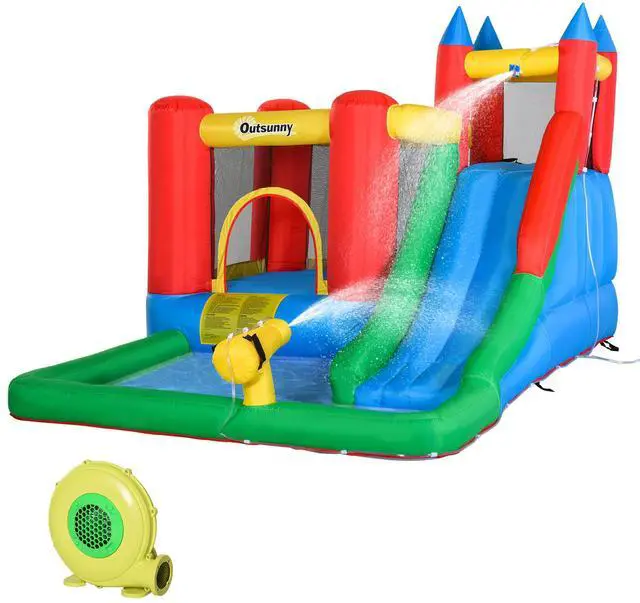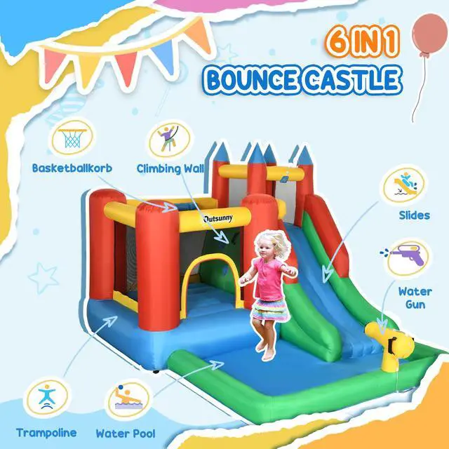 - - Five activities, including a slide, climbing wall, trampoline, pool, and water gun