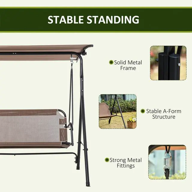 Swing through the summer and soak up the sun on an Aosom outdoor porch swing chair. Made with a heavy-duty steel frame crafted into a stable A-shape, it seats two adults. Place it in outdoor spaces like, the porch, by the poolside, garden, by the backyard, or on the balcony. Featuring quick-drying mesh and an adjustable canopy that lets you swing even if there's been rain. Tilt the top so you can stop sunburns and get rid of glare. Get out, get comfortable, get Aosom.