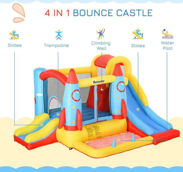 Jump, slide, climb and more! This inflatable castle includes 1 trampoline, 2 slides, 1 pool area, and 1 climbing wall for many ways to play. Transport the toddler bounce house from place to place with the storage bag. Keep your child safe and secure with they play! The bounce house includes 5 ground stakes to keep the structure stable, even on windy days. Save time and hassle with the electric air blower! This bouncy house for kids inflates in minutes so your kids can start playing in no time.