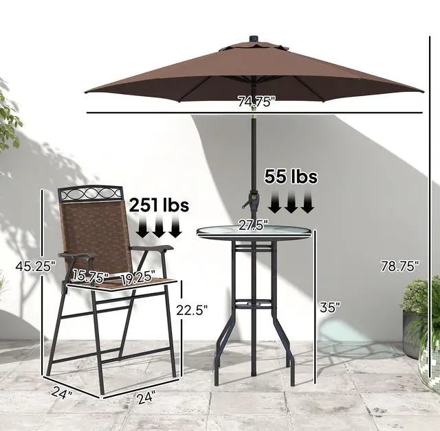- - Four-piece set includes two folding chairs, a dining table, and an umbrella