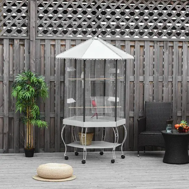 Give your birds a spacious, well-designed home with this Aosom indoor/outdoor aviary cage. It includes multiple feed boxes and wooden perches for perching and play. Two large front doors and a removable bottom tray allow easy access and quick cleaning. Made from durable iron with a pet-safe finish, the cage features 0.5" spaced metal wire to help prevent escapes and keep predators out. A metal stand with six rolling casters makes moving the cage easy.