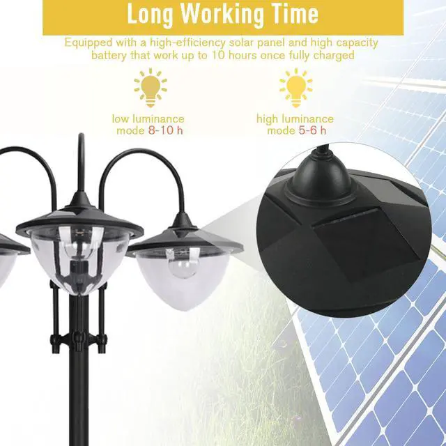 Don't hassle with wires; Aosom's 3-head solar lamp post has classic style and powers itself. Ensure your patio, driveway, or garden is well-lit with three sources of light for extra range. Custom-tailor it to your landscape when you fill the planter below with the flower of your choice. Capable of turning on at dusk and off at dawn all by itself, you can have someone "leave the light on" without ever having to ask "someone". A set-it-and-forget-it outdoor lighting solution by Aosom.