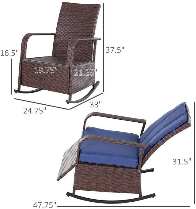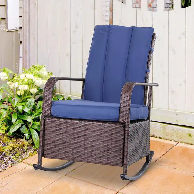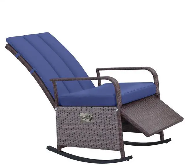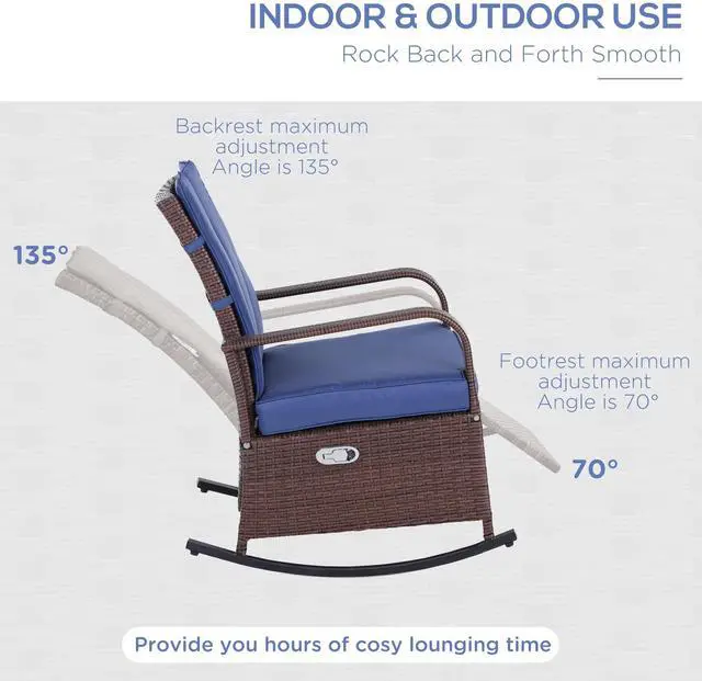 The Aosom outdoor adjustable reclining rattan rocking chair with footrest reclines up to 135 degrees to help you find the most comfortable position. The soft, padded cushions of the outdoor wicker chair allow you to sit or lie on the chair with your whole body comfortably relaxed. The sturdy steel frame of the patio rocker chair is made of weather-resistant and wear-resistant woven PE wicker to provide superior durability and stability and also cleaning convenience.
