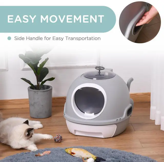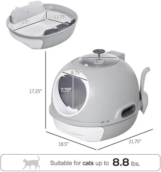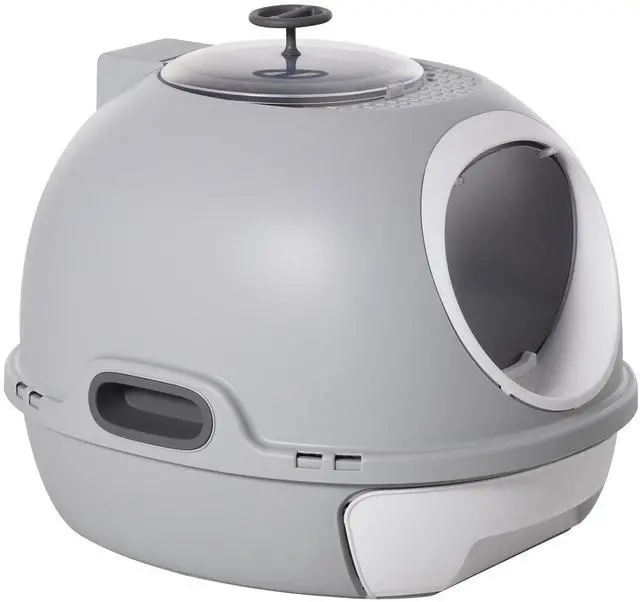 Aosom's cat litter box with lid offers a trendy and private design, providing your cat with peace of mind. Its space-capsule appearance includes a spacious main chamber for easy access, while the top panel allows natural light to create a calming atmosphere. With a detachable scoop and removable tray for easy cleaning, this stylish cat litter box with a lid is a visually pleasing addition to your home.