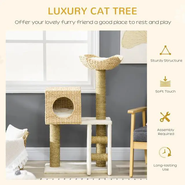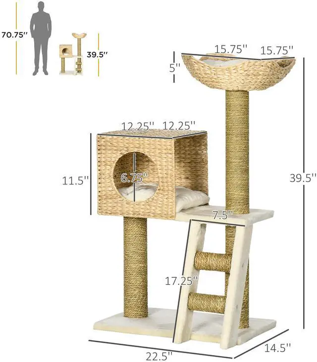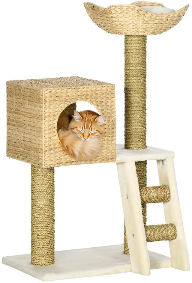 This cat climbing tower gives your furry friend a way to nap up high, offering two beds, a hiding spot in a box, and the other a doubly cushioned basket approximately three feet up, so they can jump to it from the ground. Stable for lots of cat activity, small for easy rearranging, and covered in soft fabric, this cat house tower from Aosom lets animals find their favorite nap spots. Make this kitty palace the go-to spot for playing, relaxing, or satisfying the urge to climb.