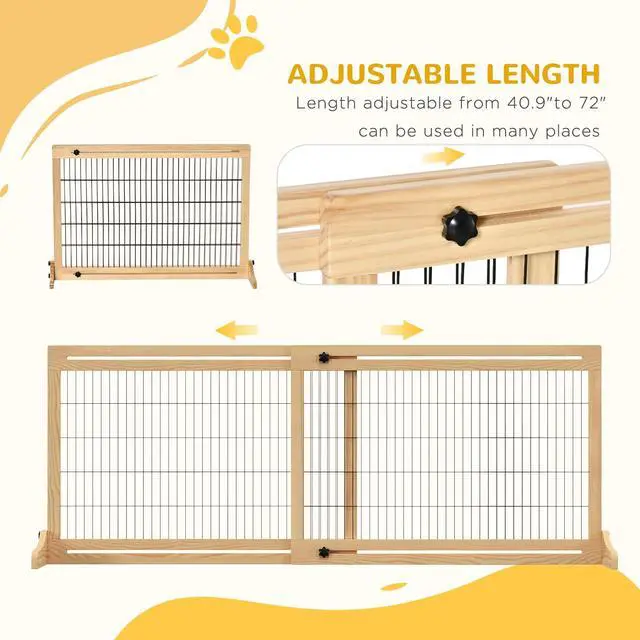 Keep your pets out of the places they shouldn't be with the freestanding pet gates for dogs that you can pick up and move to other parts of your home. Use this wooden pet gate from Aosom to block off spots indoors and out to keep your furry friends safe. Install it between doorways, staircases, hallways, decks, and patios. The freestanding gate extends to 70.9" in length. Keep your pets contained without the worry of them getting hurt or escaping.