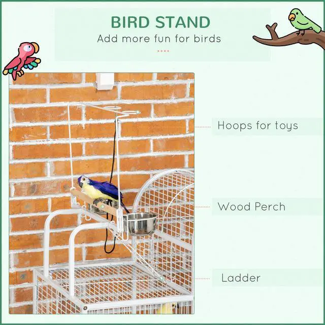 - - Outer perch and ladder for more fun, featuring two bowls to access needs and hooks for hanging toys