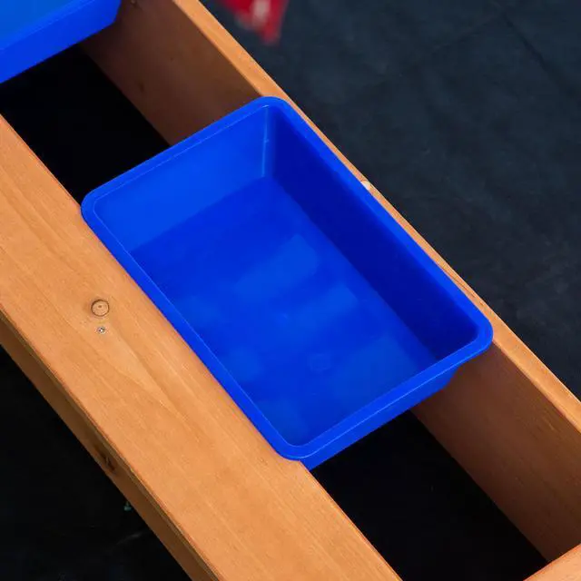 Featuring a cover, this Aosom sandbox for kids shades little ones against burns, ensuring skin health in addition to providing rain protection. Not only is there a canopy, but the roofing bends in the middle, allowing blockage of the sun when it's at different angles. This play sandbox's roof moves all the way down to act as a lid. The toy bins, paired with the box they're in, allow expansive storage that's organized into separate compartments, allowing two kids to each have their own.