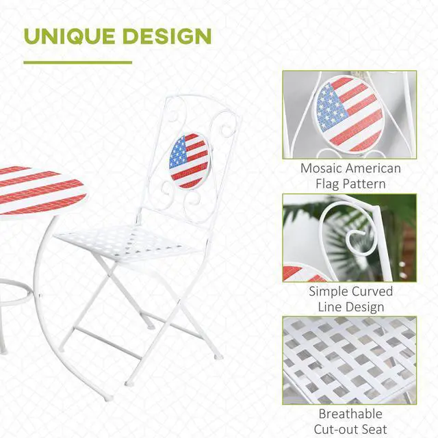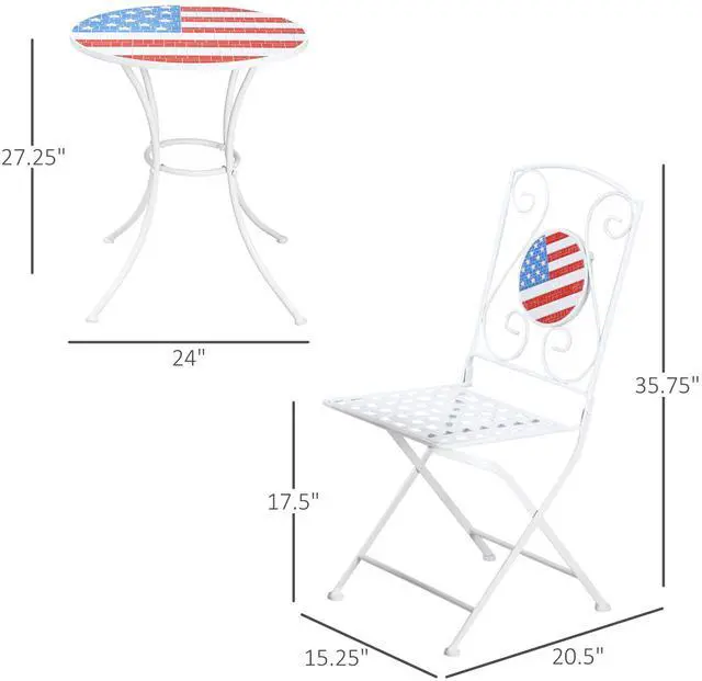 Put out a flag for the USA this Fourth of July and be patriotic all the way to President's Day with Aosom. Our United States flag mosaic folding bistro set features metal flourishes, making it a formal option for the patriot in your life. Eat dinner, serve drinks, read, and entertain on an eye-catching outdoor display. Invite a friend over. Our garden table and chairs fold up for fast set up, tear down, and storage. Get patriotic decor that does more. Get out, get festive, get Aosom.