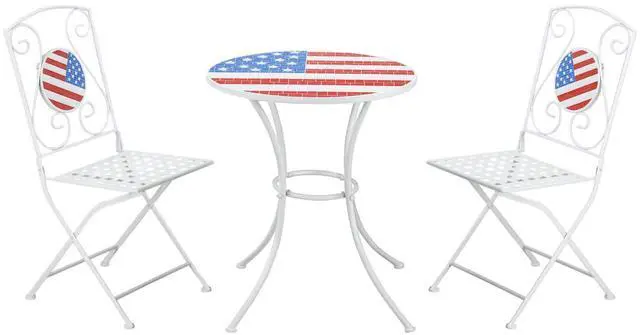 - - Three-piece patio bistro set includes an American flag table and two USA-themed chairs