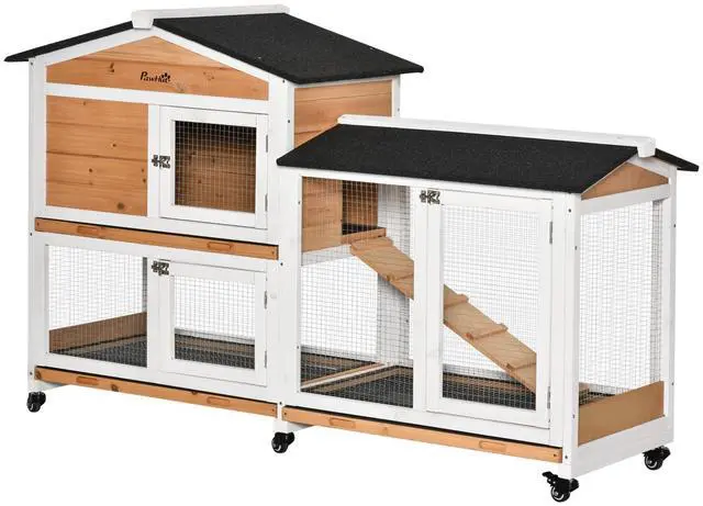 This rabbit house from Aosom is great for use with rabbits, guinea pigs, and other similar-sized animals. This deluxe wooden rabbit enclosure is an ideal mix of safety and freedom and offers all the comforts of home. The upper area is designed for privacy and rest, while the lower site offers more space for run and play. The lockable doors and slide-out trays provide easy cleaning and other routine tasks. Get your furry friend a comfortable living space from Aosom.