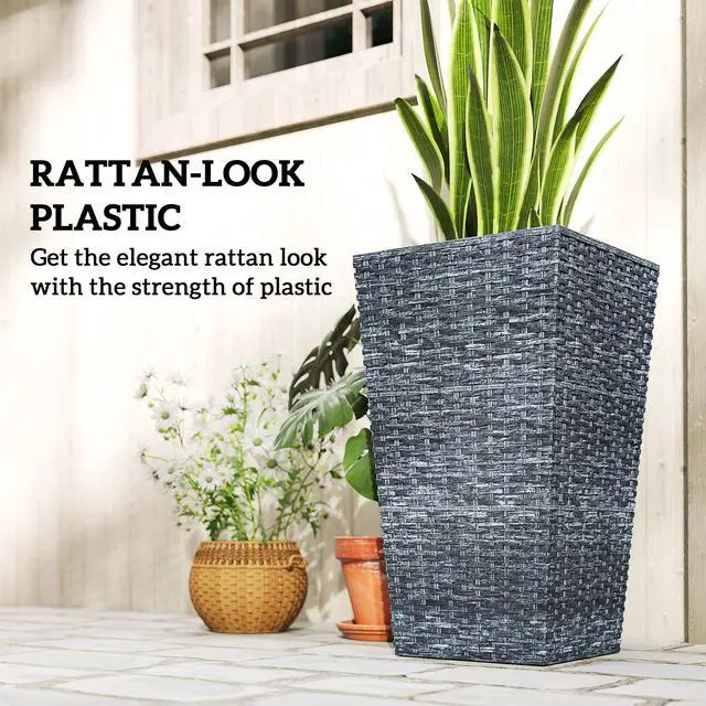 • Aosom Tall Planters for Outdoor Plants Set of 3, 24 In Taper Planters with Drainage Holes, Rattan Decor Plant Pots for Indoor Outdoor Front Porch Patio Backyard, Gray