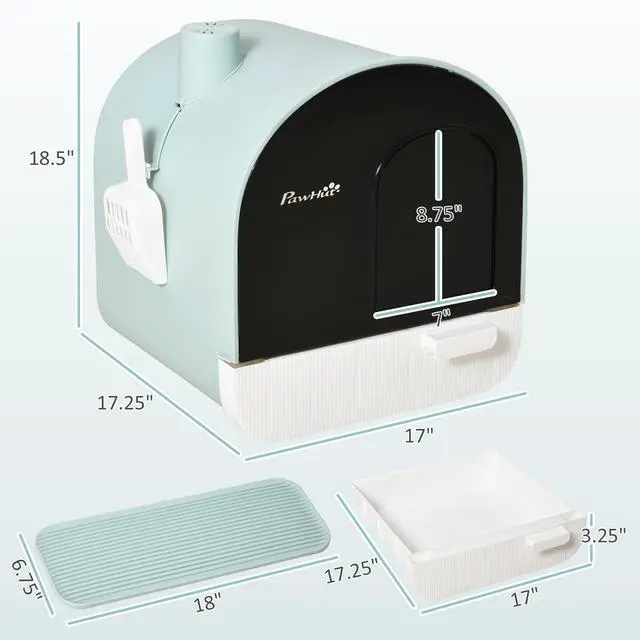 The Aosom hooded litter box will give your cat complete privacy to put them at ease. Our covered cat litter box features an air filter to stop smells from escaping. It comes with a litter scoop that attaches to the side so it won't get lost, and its removable tray makes cleaning dirty litter easy. The cat litter mat in front catches spill outs preventing the transfer of litter to the carpet. A sleek piece with simple colors, its cute hut-like shape is an easy fit for your home.