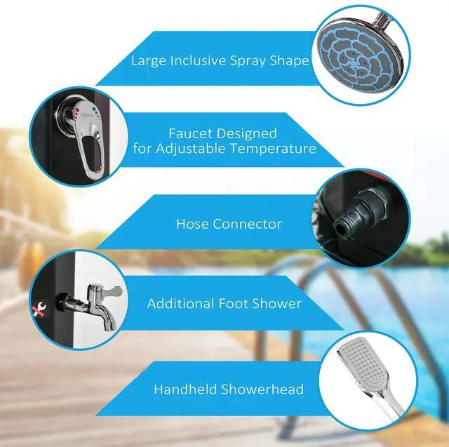 Aosom pool showers for outside are great for outdoor pools. No more tracking dirt into the house to wash off chlorine; now you can have a pool shower just like the professionals. Adjust the angle of the head to optimize for any height. Set the pressure and temperature to customize for comfort. Use the detachable handheld showerhead and bottom faucet to wash away hard-to-reach dirt and debris, or even wash your dog. Relax, pool time isn't a mess with Aosom outdoor pool shower.