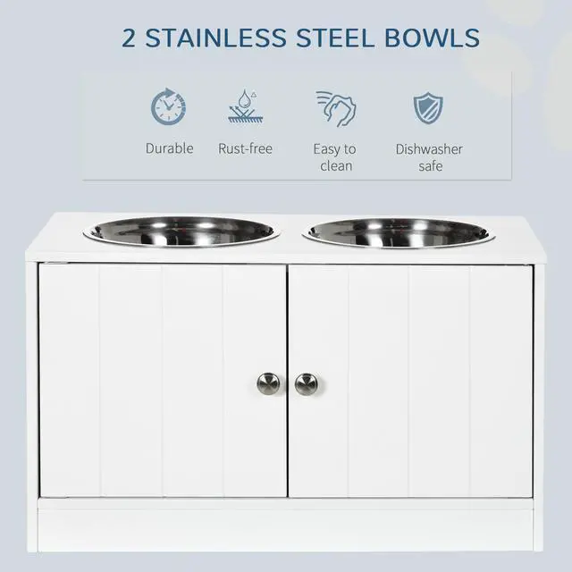 • Aosom Large Elevated Dog Bowls with Storage Cabinet Containing Large 44L Capacity, Raised Dog Bowl Stand Pet Food Bowl Pet Feeding Station, White
