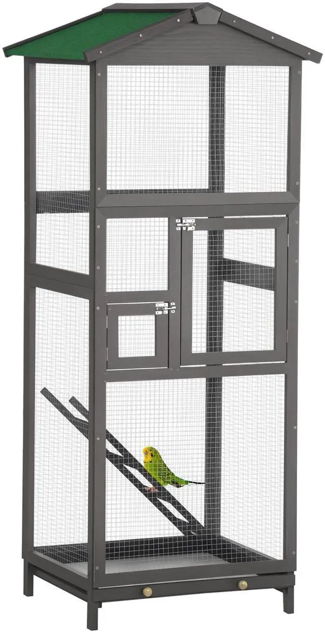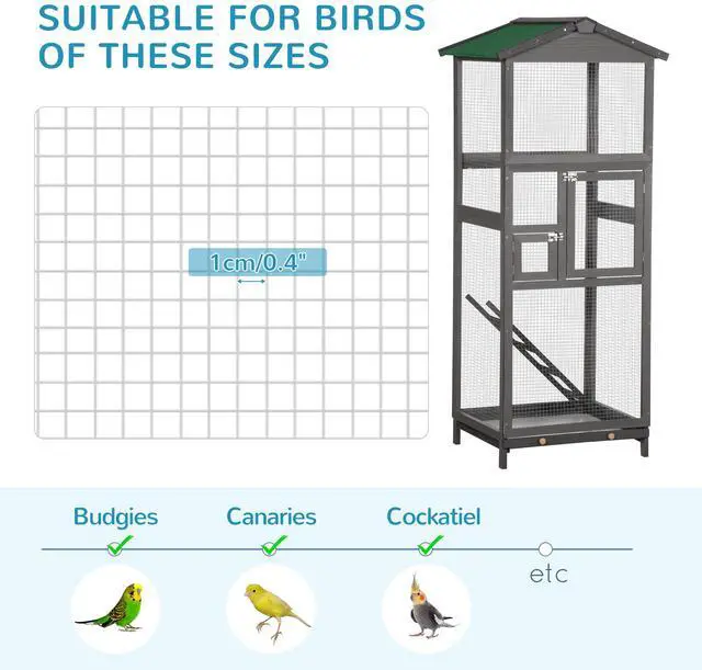 Keep your birds happy in the roomy interior of this outdoor bird aviary, offering a design not only large in its interior but large with its door access. The 2 doors at the front ensure easy access to your birds' food, water, and the inside area. The roofing and materials are tough against weather for outdoor use. The pull-out bottom tray makes cleaning quick and easy. Offering strong wire, this large cage for birds from Aosom is made for a better bird home.