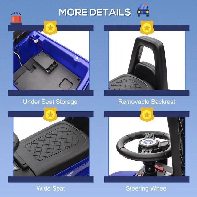 Complete with a PA system that really drives noise through speakers, this ride-on car provides a super fun outlet for imagination, that's alive, loud, and interactive. The vehicle will let kids live the life of being a cop catching bad guys, showing them how fun a microphone can be. You'll find them using the under-seat storage compartment as part of their pretending, like they're jailing prisoners. Built for safety, this tip-resistant vehicle is designed to avoid accidents at all times.
