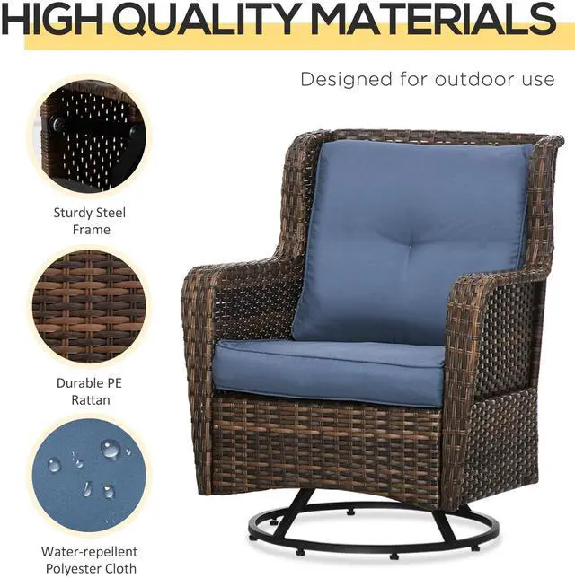 Our three-piece patio furniture set offers the same rocking experience you love from indoor furniture. Included are a swivel rocker for you and a friend and an outdoor coffee table to share. Thick tufted cushions make for a seat that's easy to sit in and easy on the eyes. The fun and functionality of a rocking chair and a swivel stool come together in a single set. Enjoy dining, drinks, or a game. Each piece is hand-woven yet water safe for outdoor longevity. Get out, get comfy, get Aosom.