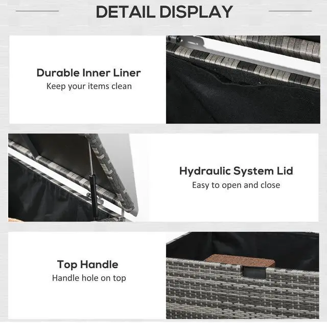 113-gallon pool trunk with waterproof liner from Aosom is a solution for keeping your tools, or other accessories dry and clean. A safe and swift pneumatic bar lift mechanism, access your belongings has never been simpler. Handwoven PE rattan wrapped on the steel frame, adds a touch of classic aesthetics while offering enhanced water resistance. Whether you place it on your porch, patio, balcony, or poolside, the Aosom wicker storage chest is the great choice for outdoor storage.