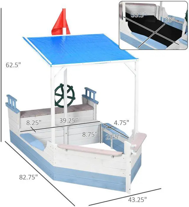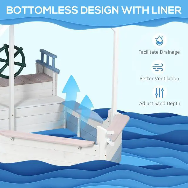 For children with strong imaginations or kids who love pretend play, a boat shape makes this an extra fun wooden sandpit. Equipped with a bench and covered by a canopy, it offers a comfortable interior. The large size is spacious enough for four children to dig, build, and sail. Made from solid fir wood for durability, Aosom's sandbox has a polished and splinter-free smooth wood surface that ages well as your child ages.
