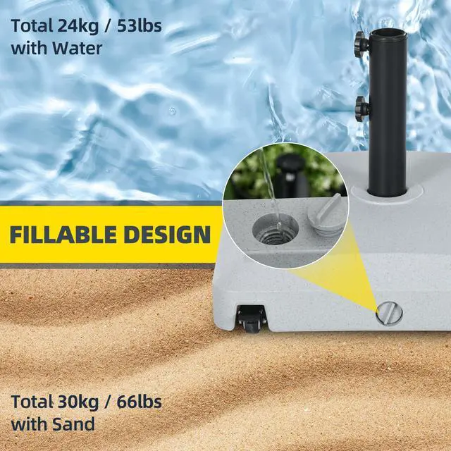 Make your market umbrella mobile with Aosom. Aosom offers an umbrella base that's adjustable to hold it in place. It fits a range of diameters and reaches up to 66 lbs. when filled with sand. Easily fill and clean it with a spout found on the side, making gravity do most of the work. Wheel it from the porch to the poolside, into the shade, or inside for the season. Create your own oasis with Aosom.