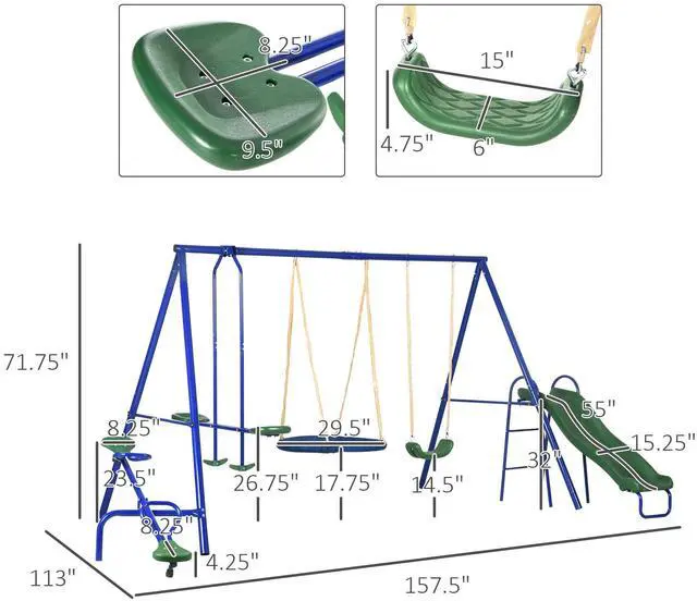 With a seesaw, two-person glider, saucer swing, traditional swing, and slide, there are plenty of activities to entertain a group of up to seven kids at once. They'll play together on a safe swing set, thanks to heavy-duty construction and pinch-free chains. Provide kids hours of warm-weather fun when you bring this top-tier outdoor toy to your home. Aosom upgrades playtime.