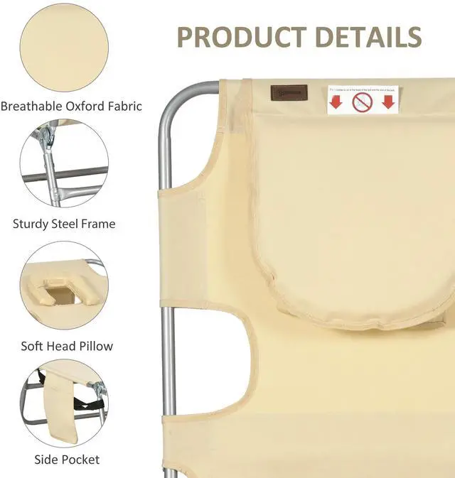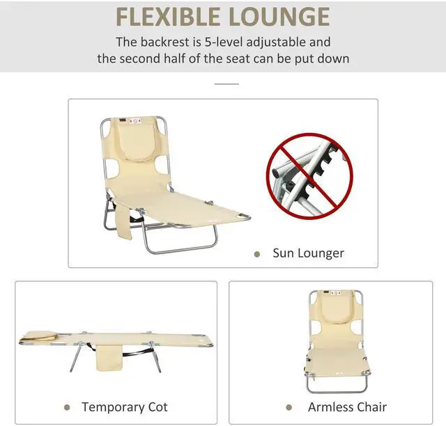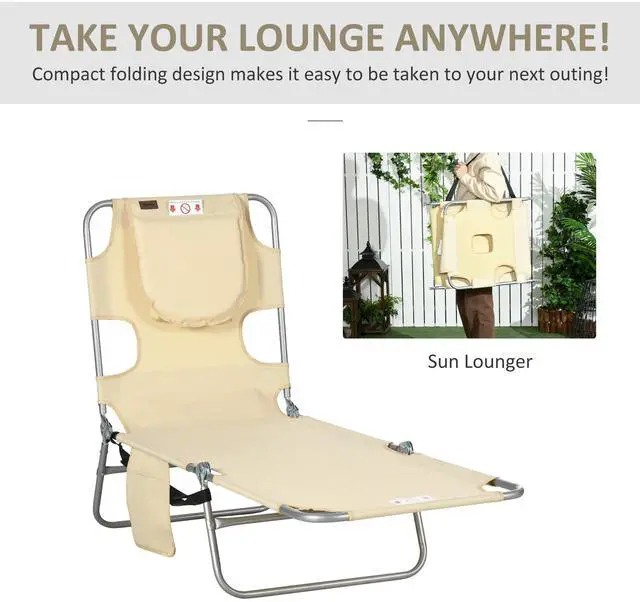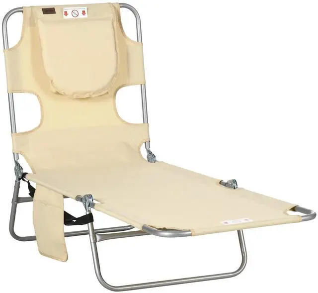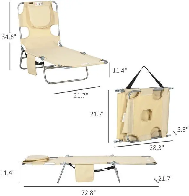 Do you wish you could bring the comfort of the resort on the road with you? You're a step closer. Aosom has a folding chaise lounge so you can relax in the sun at the beach. Enjoy the outdoors; it features a 5-position reclining backrest, a reading hole for your head and arms, and a pillow. Place items in the pocket to keep them nearby. Made with tough Oxford fabric and water-safe powder-coated steel, it will follow you wherever the wilderness takes you. Get out, get comfy, get Aosom.