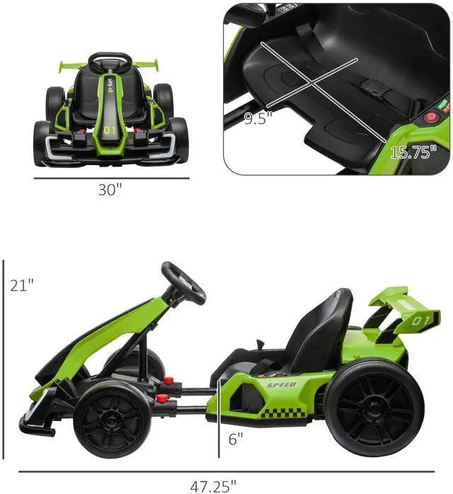 Ignite boundless outdoor excitement with our Aosom electric go-kart. Your young speedster will experience the thrill of a lifetime as they drift and race. Equipped with a powerful 24V dual-drive motor, they'll conquer speeds up to 7.5 mph, fostering a sense of adventure. Bring greater immersion with a realistic horn and music controls for realism in every ride. Elevate playtime with a superior ride-on experience, spark imagination, and raise the hype factor.
