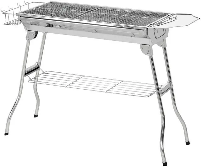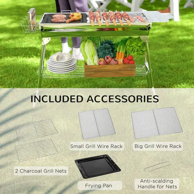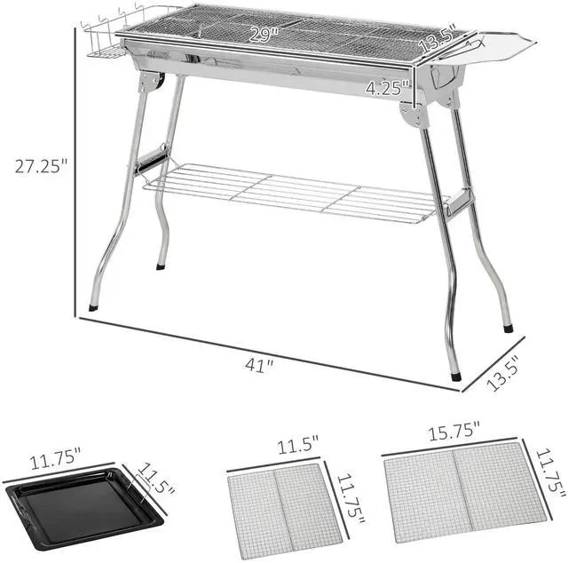 If you like to cook out while camping, tailgating, or picnicking away from home, Aosom portable charcoal grill is an easy choice. Made of stainless steel, our BBQ grill endures weather with ease. With a foldable design, you can bring it anywhere. Small when you need it to be, large when you don't; its grill grate and pan allow you to cook yakitori, hibachi, steaks, burgers, fish, and corn. Storage on all sides allows room for charcoal, ingredients, and seasonings in a portable all-in-1.