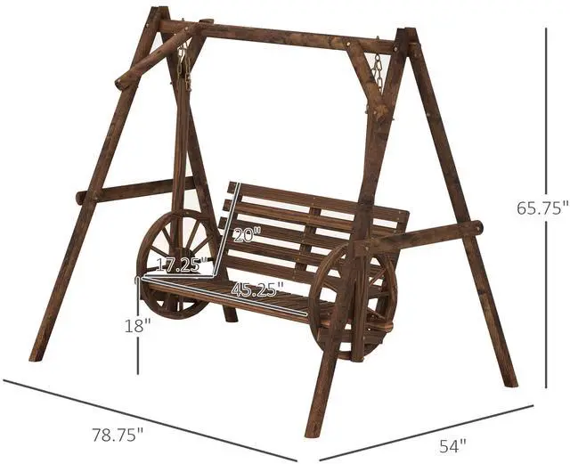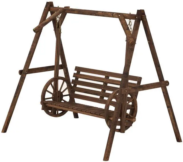 Bring rustic country charm to your backyard with Aosom's outside swing with wagon wheel armrests. Constructed of carbonized fir wood with a varnish coat, this backyard swing is built to endure the outdoors and look good doing it. Like a loveseat for your lawn, it offers room for two. The bench is held up with a strong A-frame, so it won't wiggle. A 2 person swing is a great excuse to spend more time out in the garden, yard, or outside in general. Get out, get comfy, get Aosom.